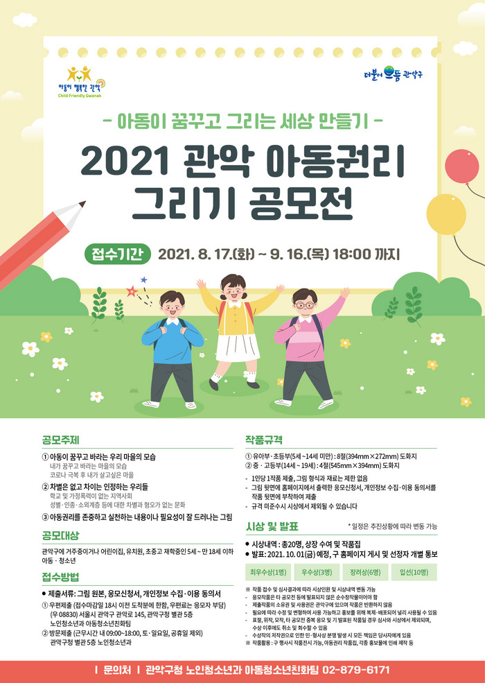 구는 제출된 작품을 심사해 최우수, 우수 등 총 20작품을 선정해 상장을 수여하고, 수상작은 행사 전시, 아동권리 작품집 수록 등 각종 홍보에 활용된다. 10월 중 구 홈페이지를 통해 선정작을 발표할 예정이며, 더 자세한 사항은 관악구 노인청소년과로 문의하면 된다.