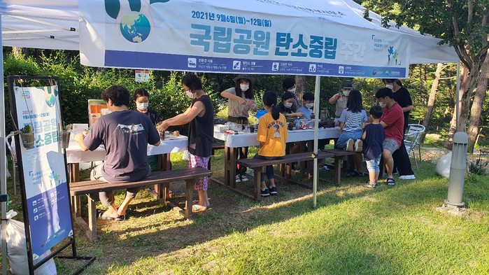 무등산국립공원동부사무소는 탄소중립 주간 행사로 도원야영장 이용객 대상 탄소중립 실천 빙고 게임과 재활용품을 활용한 나만의 화분 만들기, 그린포인트 적립하기, 야영장 주변 정화 활동, 분리수거 세분화 등 다양한 체험 프로그램을 운영해 일상생활에서도 탄소중립을 쉽게 실천할 수 있음을 알리고자 했다.