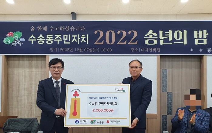 군산시 수송동은 주민자치위원회(위원장 김용호)가 지난 7일 희망2023나눔캠페인 이웃돕기성금 200만원을 기탁했다고 8일 밝혔다.