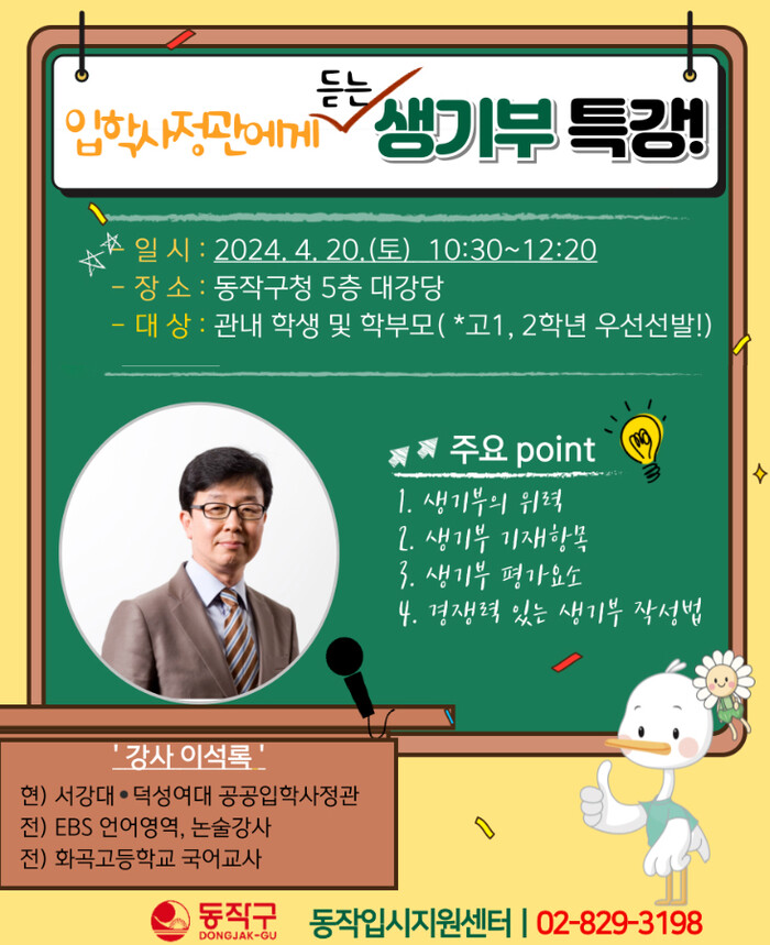 강의는 오는 20일 오전 10시 30분부터 약 2시간 동안 동작구청 5층 대강당에서 진행되며 EBS 수능특강 국어 대표강사였던 이석록 서강대·덕성여자대학교 입학사정관이 강연자로 나선다.