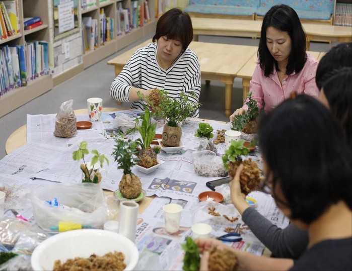 ▲전농SK아파트 ‘꿈땅’ 북카페 회원들이 토피어리를 만들고 있다. |