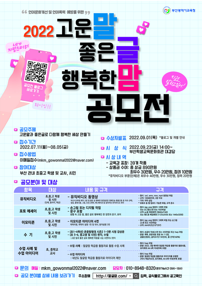 이번 공모전은 언어폭력을 예방하고 언어문화를 개선하기 위해 ‘고운 말과 좋은 글 사용으로 다함께 행복한 세상 만들기’를 주제로 실시한다.