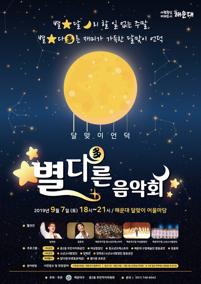 갤러리·문학관 등 문화예술 인프라가 풍부하고 천혜의 자연환경을 자랑하는 달맞이언덕을 널리 알리고 지역민에게 수준 높은 문화공연을 제공하기 위해 추진하는 행사로 아트마켓, 구립예술단 합동공연, 대중가수 양희은·정훈희의 공연이 펼쳐진다.