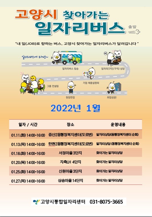 [로컬세계 강영한 기자]경기 고양시(시장 이재준) ‘찾아가는 일자리버스’가 2022년 11일 중산2동 행정복지센터를 시작으로 탄현2동 행정복지센터, 서정마을 3단지 등 아파트 단지를 순회 방문한다.