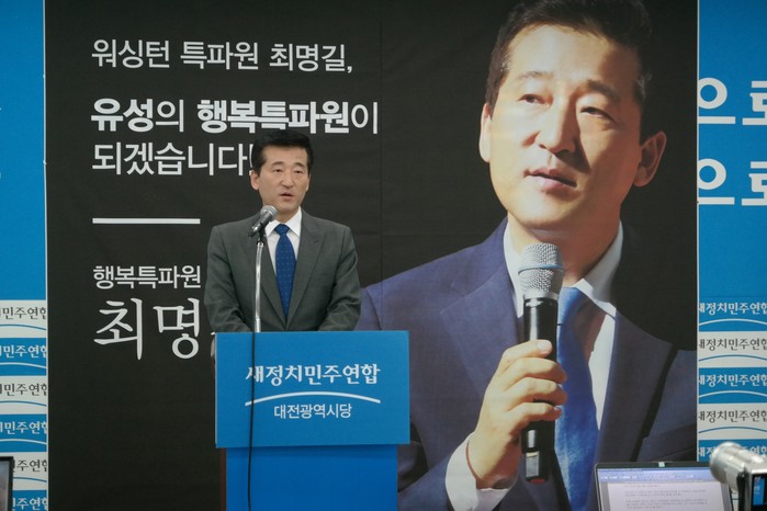 [로컬세계 오영균 기자] 최명길 전 MBC유럽지사장이 13일 새정치민주연합 대전시당에서 내년 4월 13일에 치러지는 제20대 국회의원 총선거에서 대전 유성구에 출마해 유권자의 선택을 받고자 한다며 본격적인 총선출마를 선언했다.
