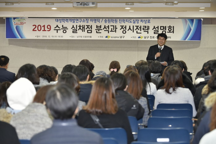이번 입시설명회는 1부 2019년 수능 실채점 분석과 정시지원 전략 및 2부 대구·경북권 대학 지원 전략으로 나뉘어 진행됐으며, 수험생 및 학부모들에게 입시전략을 제공했다.