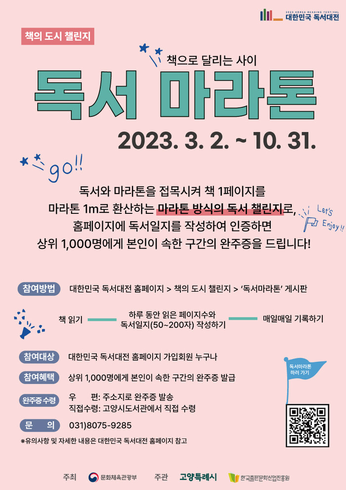 이동환 고양시장은 “매일 조금씩 책을 읽고 그 기록을 쌓아간다면 어느새 독서습관과 함께 성취감도 얻을 수 있으리라 생각된다. 보다 많은 시민들이 마라톤 완주의 기쁨을 누릴 수 있길 바란다 ”고 말했다.