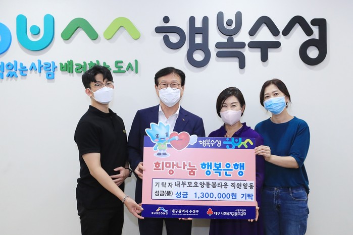 이 성금은 내부모요양돌봄타운 직원들이 이웃사랑의 마음으로 십시일반 모아 마련됐다. 수성구청은 기탁 받은 성금을 다양한 복지사업에 사용할 예정이다.