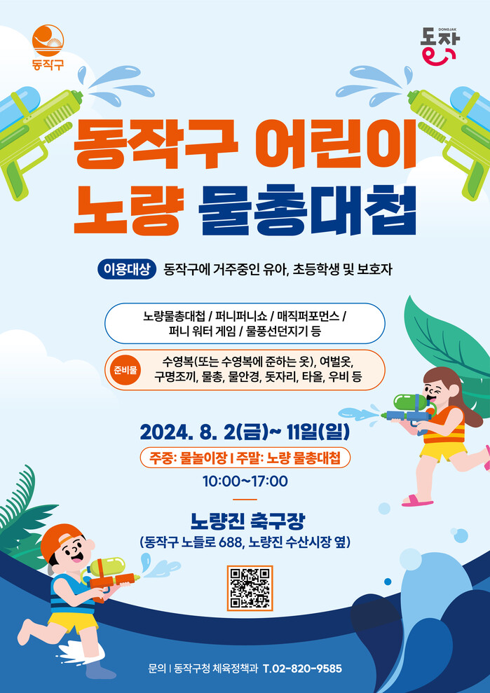 31일 동작구에 따르면 구는 노량진수산시장 옆 축구장에 내달 2일부터 11일까지 물놀이장을 상시 운영하며, 같은 기간 주말인 3·4·10·11일에 물총대첩을 연다고 밝혔다.
