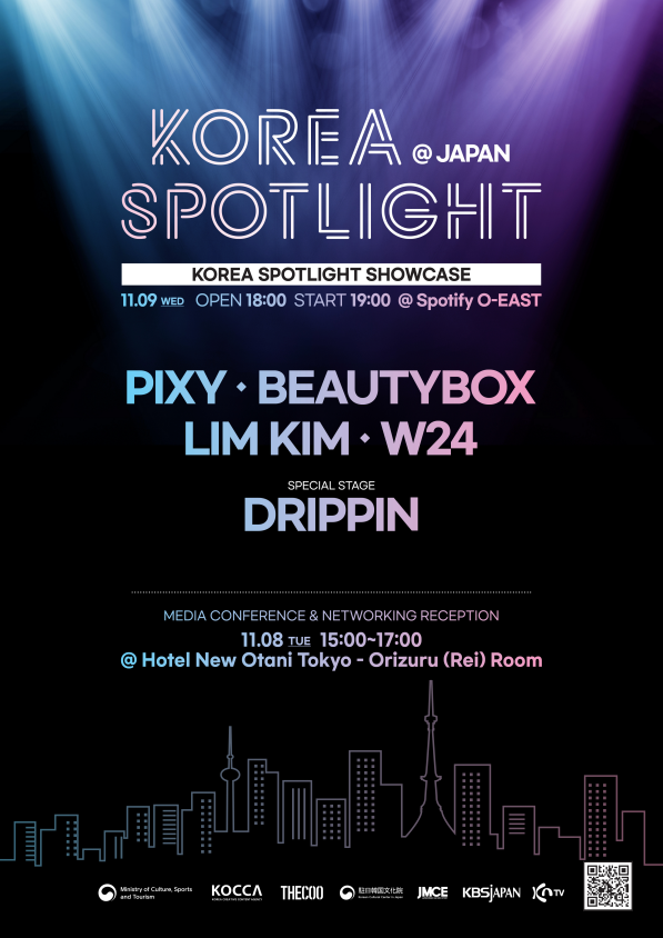 9일 일본 도쿄의 중심 시부야 스포티파이 오이스트(Spotify O-East) 공연장에서 열린 코리아 스포트라이트는 ▲글로벌 아이돌 픽시(PIXY) ▲다국적 6인조 걸그룹 뷰티박스(Beauty Box) ▲싱어송라이터 림킴(Lim Kim) ▲글로벌 케이팝 밴드 W24 ▲7인조 다국적 보이밴드 드리핀(Drippin) 등 5팀이 각자 개성 넘치는 음악을 일반 관람객과 일본 음악관계자들에게 선보였다.