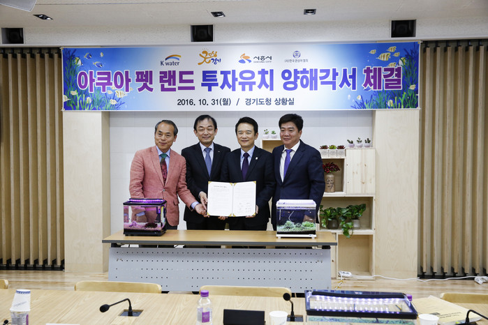 남경필 경기도지사, 김윤식 시흥시장, 이학수 한국수자원공사 사장, (사)한국관상어협회 심홍석 회장은 31일 경기도청 상황실에서 ‘아쿠아 펫 랜드’ 투자유치 양해각서를 체결했다.