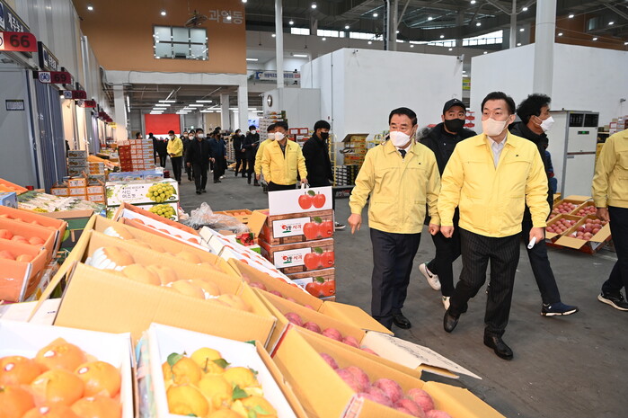 ▲ 지난 13일 이재준 수원특례시장이 수원시농수산물도매시장에서 안전점검을 하고 있다. |
