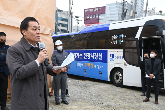 ▲ 지난 11월 팔달구 지동에서 시민들과 함께 현장을 둘러보기 위해 찾아가는 현장시장실을 연 이재준 수원특례시장이 이야기를 하고 있다. |