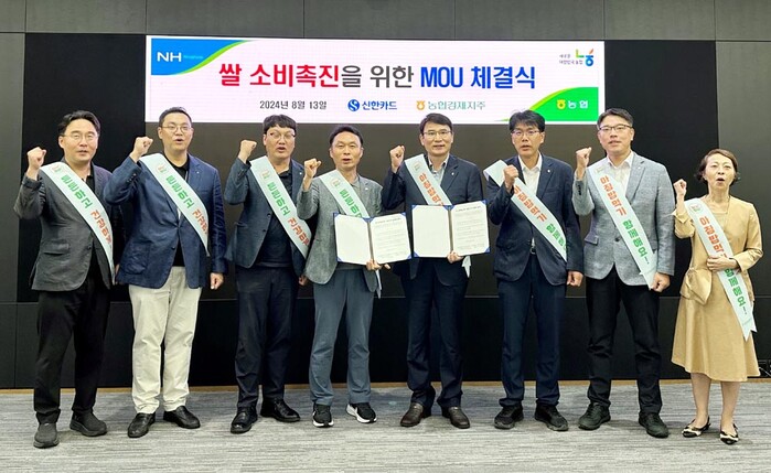 이날 심민섭 농협경제지주 소매체인본부장, 박석희 신한카드 경영지원그룹장 등 양사 임직원 10여 명은 서울시 중구 신한카드 본사에서 ‘아침밥 먹기 상생협력’업무협약(MOU)을 체결, 임직원 대상 아침밥 할인 지원 등 쌀 소비 활성화를 위해 적극 협력하기로 했다.