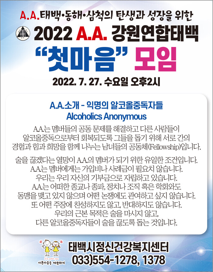 [로컬세계=박상진 기자]강원 태백시정신건강복지센터는 단주 또는 절주 중이거나 이를 희망하는 지역주민을 대상으로 ‘ A.A.태백 첫마음’ 모임을 개최한다고 22일 밝혔다.