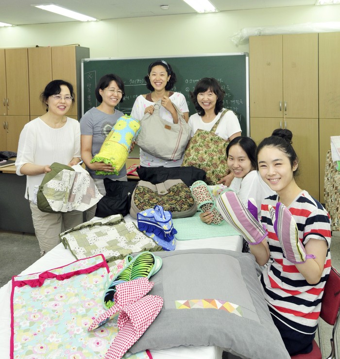 ▲지난 여름 여성교실 홈패션 수강생들이 각자 만든 작품들을 들고 기념촬영을 하고 있다.(양천구 제공) |