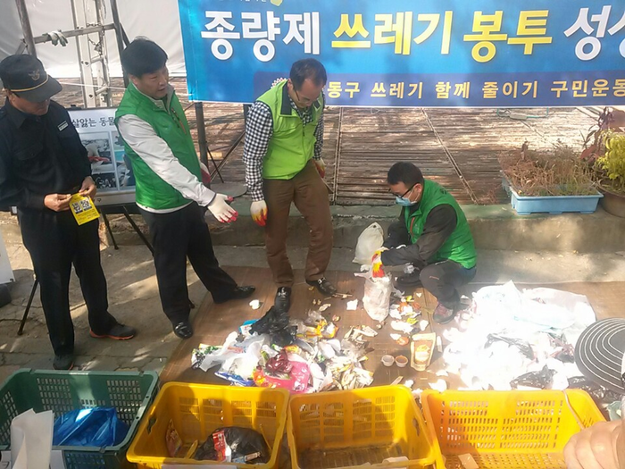 강동구는 지난해 2월 부구청장을 단장으로 쓰레기 줄이기 실천 TF팀을 구성하고 4월에는 쓰레기 함께 줄이기 구민운동본부를 구성해 민·관 합동으로 생활폐기물 감량에 나섰다.