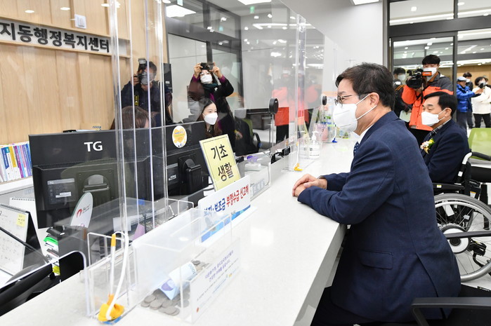 | ▲염태영 수원시장이 인권청사로 건립된 지동행정복지센터 개관식에서 장애인 단체와 함께 장애편의 시설을 확인하고 있다. 수원시 제공 |