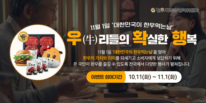 ‘우(牛)리들의 확실한 행복’을 슬로건으로 전개하는 이번 캠페인은 대국민을 대상으로 ‘한우 먹는 날’의 의미와 한우의 가치, 우수성 등에 대해 알리고, 한우 소비촉진을 도모하기 위해 이번 달 11일부터 11월 1일까지 3주간 진행된다.