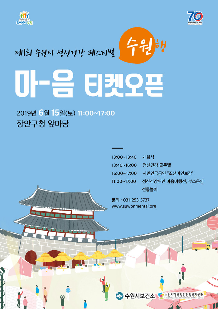 수원시행복정신건강복지센터가 주관하는 정신건강 페스티벌은 ‘수원행, 마음 티켓 오픈’을 주제로 열린다. 정신건강수도 수원으로 떠나는 기차여행이라는 의미다.