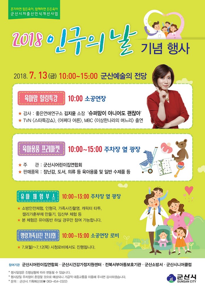 강임준 군산시장은 “이번 인구의 날 행사를 통해 그동안 육아에 지친 엄마들이 잠시나마 힐링할 수 있는 시간을 갖고 가족의 소중함에 대해 다시 한 번 생각하는 계기가 되길 바라며, 나아가 아빠의 육아참여 등 사회적인 변화로 확대되기를 기대한다”고 밝혔다.