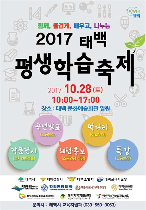 시 관계자는 “올해는 특별히 2017 태백 평생학습축제와 제2회 태백영어페스티벌이 합동축제로 추진되어 더욱 풍성한 볼거리와 즐길거리를 제공하게 되었다”며 “작품전시와 공연발표, 체험‧홍보 및 먹거리 부스 운영 등 그야말로 배움과 나눔을 실천할 수 있는 축제의 장이 될 것”이라고 말했다.