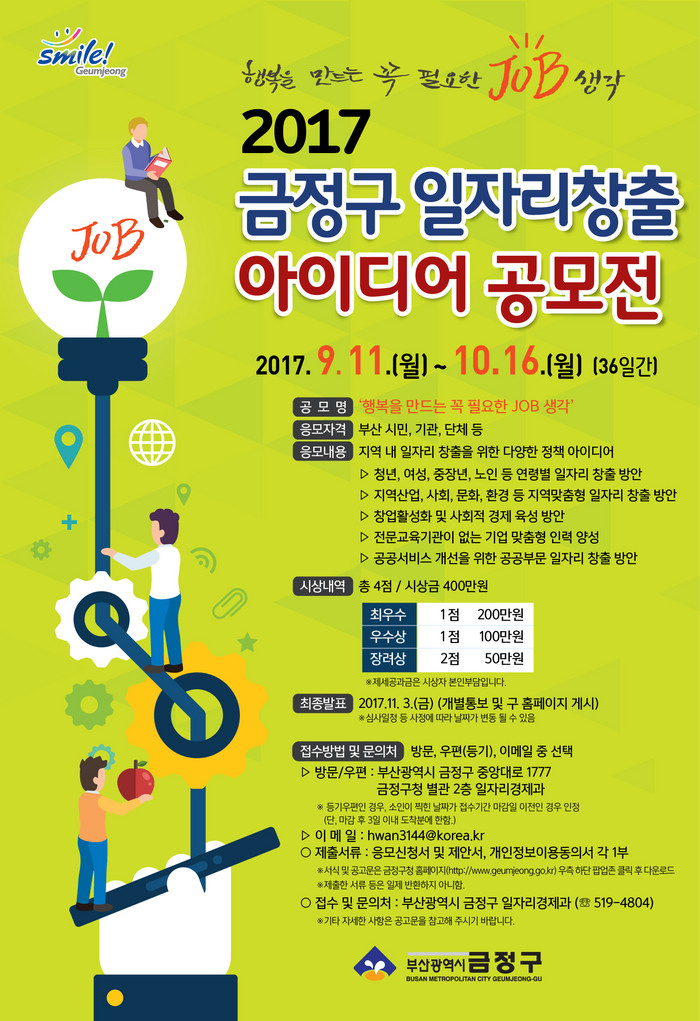 [로컬세계 맹화찬 기자]일자리가 많은 행복도시'를 지향하는 금정구는 지역 여건에 맞는 일자리 정책 발굴을 위해 오는 10월 16일까지 '금정구 일자리창출 아이디어'를 공모한다.