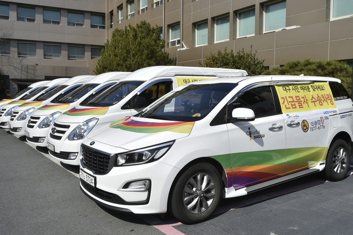 [로컬세계 박세환 기자]대구 남구는 지난 4일부터 오는 31일까지 대구시설공단에서 코로나19로 어려움을 겪고 있는 지역사회를 돕기 위해 나드리콜 차량 10대를 지원해 입원대기 중인 확진자 대상 구호물품 전달에 나섰다고 5일 밝혔다.