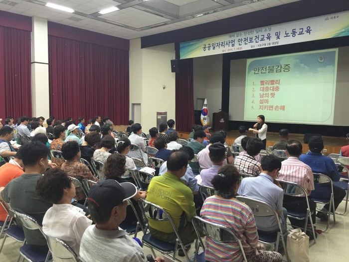 ▲서울 서초구 공공일자리 참여자들이 안전교육을 받고 있다. |