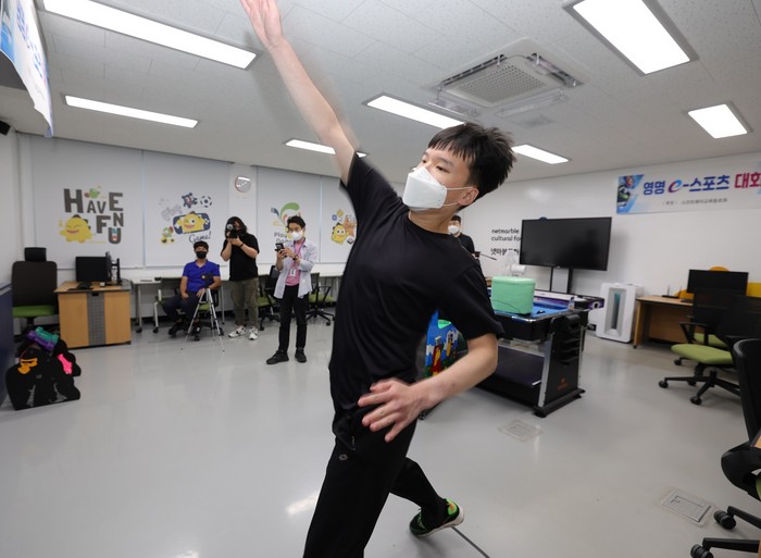 ▲‘2021 전국 장애학생 e페스티벌’ 지역예선대회에 참가한 학생이 '키넥트 스포츠 육상' 종목에 참가해 게임을 진행하고 있다. |