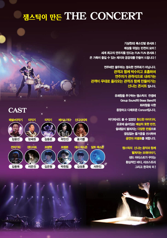 ‘더 콘서트’는 현대적 악기인 마림바, 실로폰, 마칭타악기 등의 서양타악기와 금관악기 연주에 일렉기타, 베이스기타, 신디사이져 등의 화려한 밴드사운드로 관객의 귀를 사로잡고, 연주자들의 익살스러운 퍼포먼스와 샌드 애니메이션을 직접 시연하여 관객의 눈과 귀, 마음을 사로잡는 대한민국 최고의 오감만족 콘서트이다.