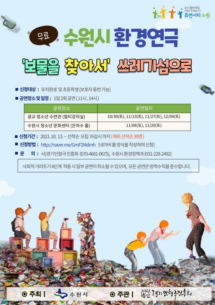 [로컬세계 김병민 기자]경기 수원시가 10월 30일부터 12월 4일까지 공연하는 환경연극 ‘보물을 찾아서’ 관람객을 선착순으로 모집한다고 18일 밝혔다.