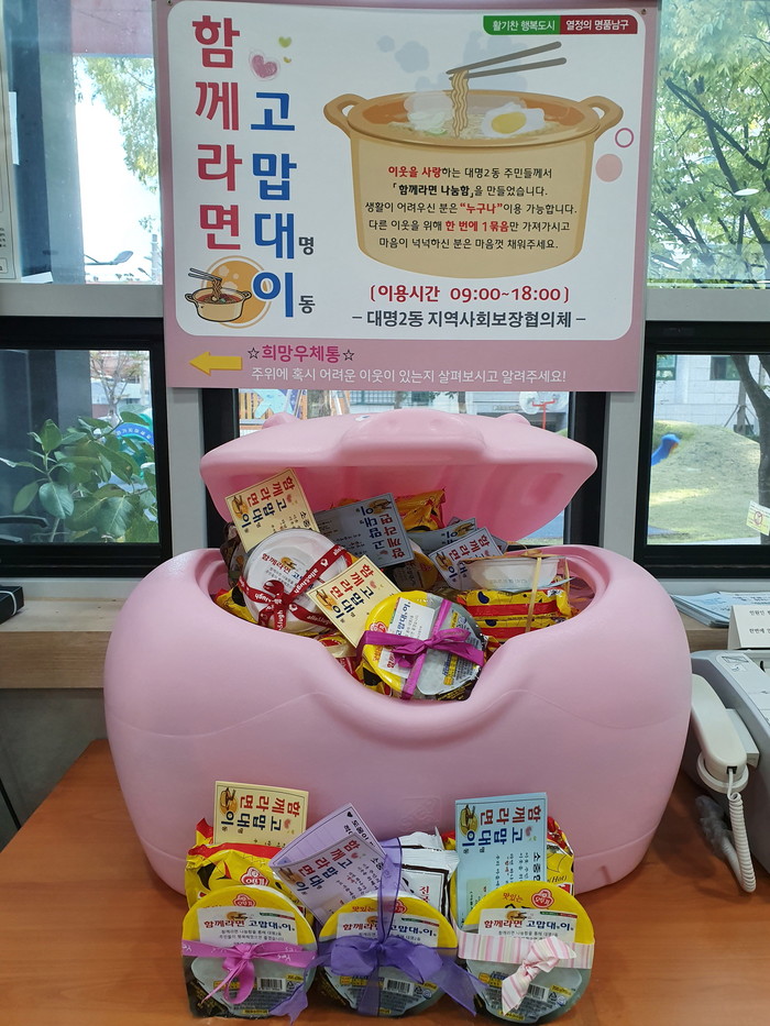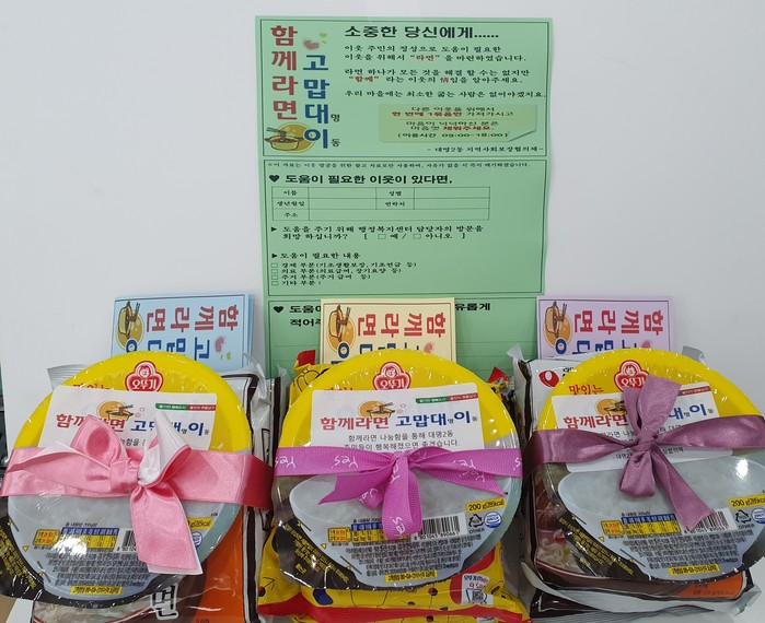 이에 대명2동 지역사회보장협의체에서 라면 2개와 일회용 밥 1개를 한세트로 구성한 ‘함께라면 고맙대이’ 라면 나눔함을 만들었다.