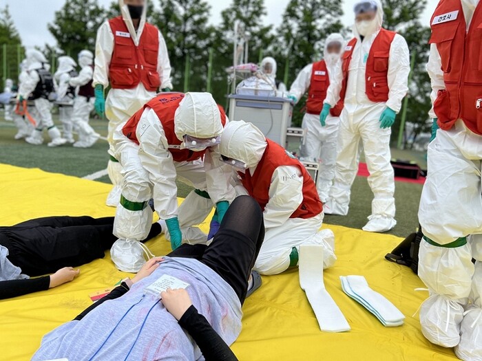 대동병원은 마취통증의학과 박주연 과장을 비롯해 간호사, 응급구조사, 방사선사, 행정요원 등 총 8명이 비상진료팀을 구성해 훈련에 참석했다.