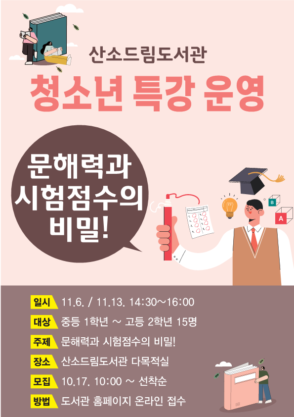 ‘문해력과 시험점수의 비밀’을 주제로 열리는 청소년 독서 특강은 1차시- ‘대체 문해력이 뭔가요?, 2차시-‘문해력이 좋으면 성적이 진짜 올라요!’ 내용으로 산소드림도서관 다목적실에서 운영된다.