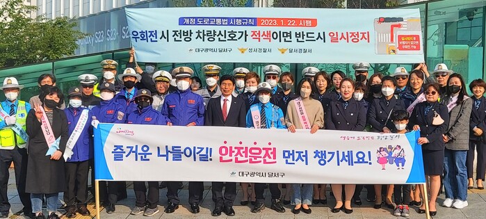 달서구는 이날 성서녹색어머니회, 성서모범운전자회 등 교통안전봉사단체와 성서경찰서, 구 직원 등 40여 명이 참여한 민‧관 합동 캠페인을 실시했다.