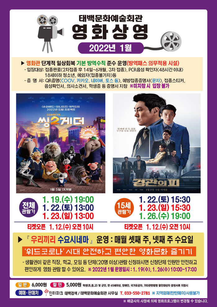 이밖에도 태백문화예술회관은 위드 코로나 시대를 대비, 안전하고 편안하게 영화를 즐길 수 있는 ‘우리끼리 수요시네마’를 매월 셋째 주, 넷째 주 수요일 오전 10시부터 오후 5시까지 운영한다.