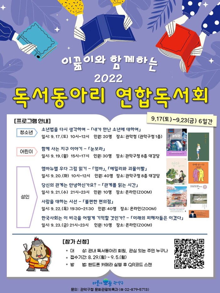 참여는 관악구 독서동아리 회원 그리고 독서활동에 관심있는 주민 누구나 가능하며 신청은 오는 9월 5일까지 홍보 포스터의 QR 코드를 스캔하여 구글폼을 작성,제출하면 된다. 기타 궁금한 사항은 관악구청 문화관광체육과로 문의하면 된다.
