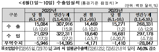 관세청은 6월 1~10일 기간 수출이 158억 달러로 작년 같은 기간보다 1.2%(1억9000만 달러↑) 늘었다고 12일 밝혔다.