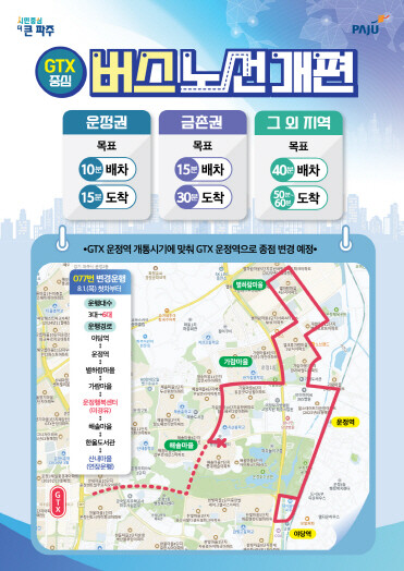 이번 개편은 인근 지역에서 지티엑스(GTX) 운정역으로의 접근성을 높이고자 시행되며 8월 1일부터 적용된다.