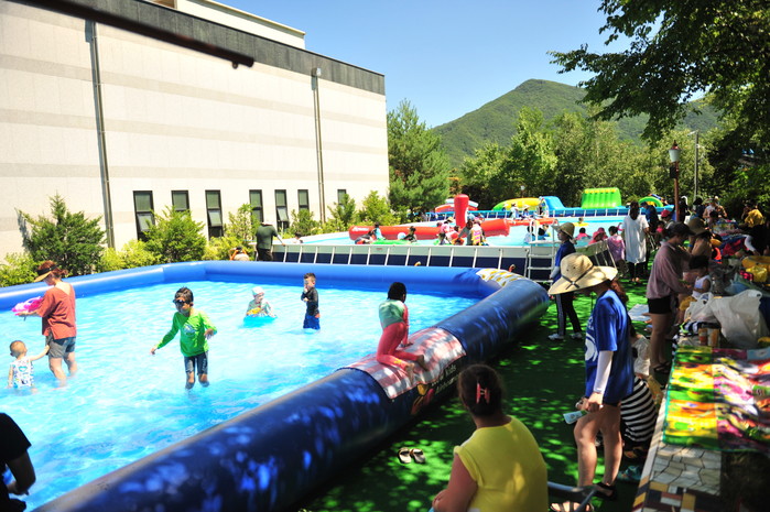 워터파크는 자녀들의 물놀이를 밖에서 지켜보는 부모들을 배려해 관람석에 그늘막을 설치하고, 물놀이 후 추위를 대비해 난방 기구를 설치했다.