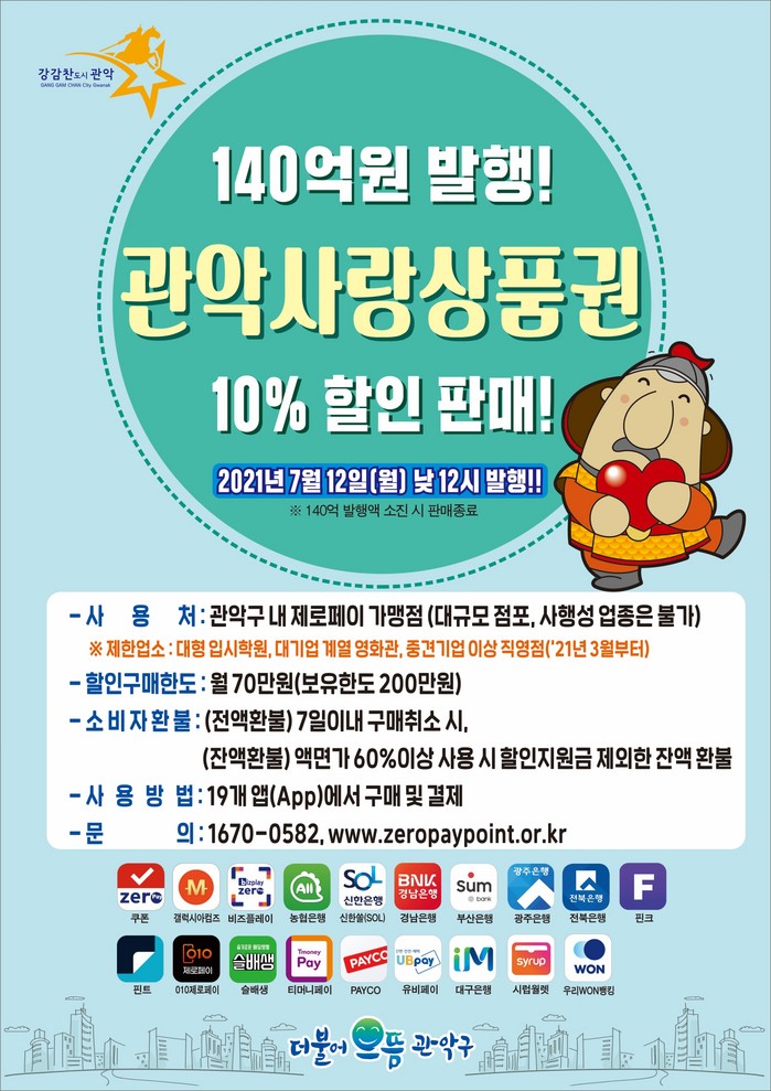 [로컬세계 임종환 기자]서울 관악구가 오는 12일 낮 12시부터 관악사랑상품권 140억원을 추가 발행한다.