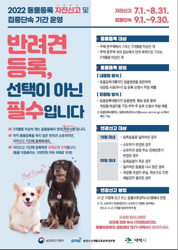 시 관계자는 “아직 반려견을 등록하지 않은 반려인이라면 이번 자진신고 기간에 반드시 반려견을 등록해 주시기 바란다”고 당부했다