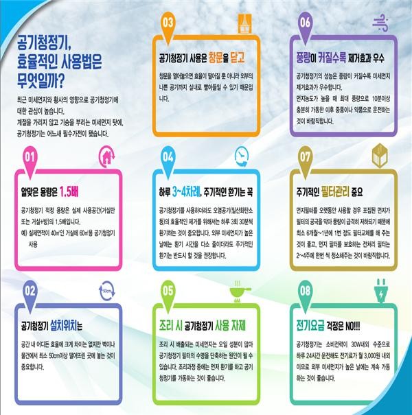 보건환경연구원은 이밖에도 공기청정기 가동 시 초기에는 최대 풍량으로 10분 이상 가동한 뒤 10분 이후부터 중간 풍향으로 변경하는 것이 효과적인 사용법이며, 외부 미세먼지 농도가 높아 자연환기가 불가능할 경우는 환기장치와 주방 레인지후드, 욕실 배기팬을 동시에 가동한 뒤 공기청정기를 켜는 것이 효과적이라고 설명했다.