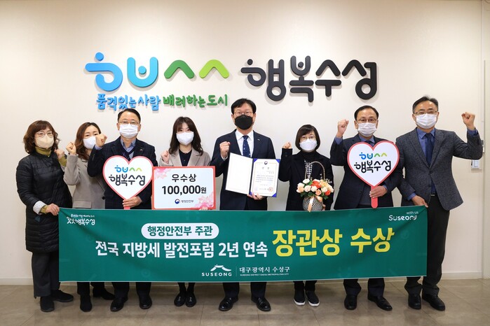 [로컬세계=박세환 기자] 대구 수성구는 지난달 17일 행정안전부 주최로 열린 ‘2022년 지방세 발전포럼’ 연구과제 발표대회에서 ‘장관상’을 수상했다고 14일 밝혔다.