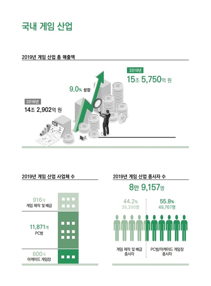 2019년 국내 게임산업 매출액은 전년 대비 9.0% 증가한 15조 5,750억 원으로 집계됐다. 수출액 또한 66억 5,778만 달러(한화 약 7조 7,606억 원)로 전년 대비 3.8% 증가한 것으로 나타났다.
