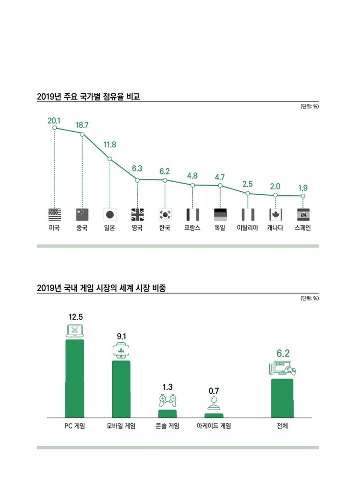2019년 세계 게임시장 규모는 전년 대비 5.0% 증가한 1,864억 9,100만 달러로 나타났다. 세계 시장에서 한국의 점유율은 6.2%로 상위 10개국 중 미국, 중국, 일본, 영국에 이어 5위를 기록하였다. 플랫폼별로 살펴보면, PC게임의 점유율은 12.5%로 중국, 미국에 이어 3위를, 모바일게임의 점유율은 9.1%로 중국, 미국, 일본에 이어 4위를 차지하였다.