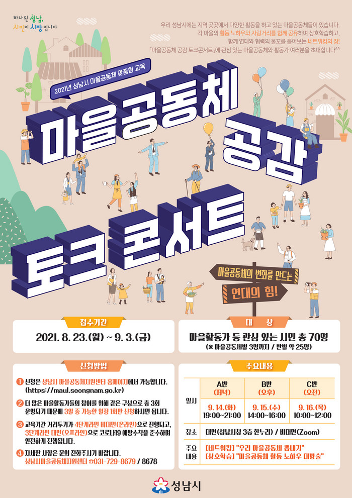 [로컬세계 김병민 기자]경기 성남시(시장 은수미)는 오는 14~16일 마을공동체 공감 토크콘서트를 온라인(ZOOM)으로 개최한다고 10일 밝혔다.