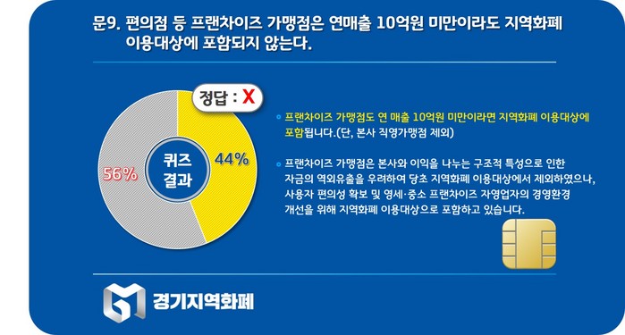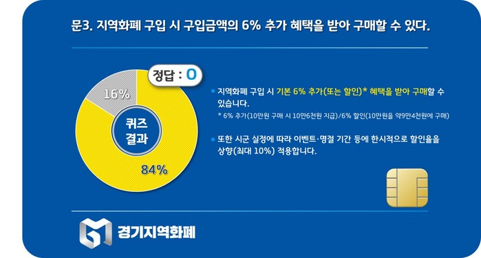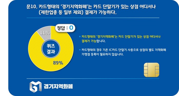경기도는 지난 7월 12일부터 지난달 12일까지 ‘경기지역화폐’ 사용방법에 대한 이해도를 돕기 위해 도민 대상 온라인 O/X퀴즈를 실시한 결과, 총 12개 문제 중 평균 9개의 정답을 맞췄다고 12일 밝혔다.