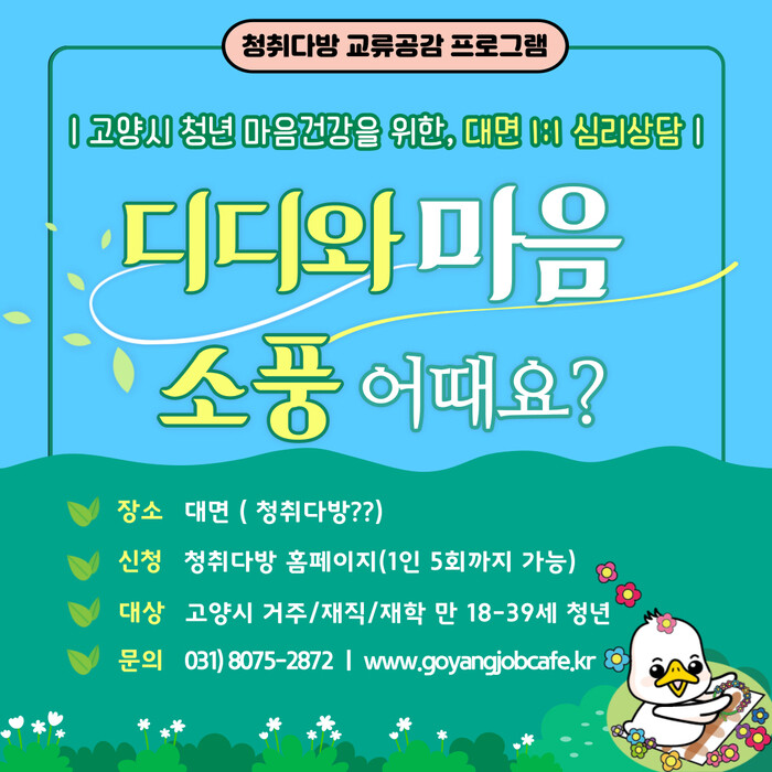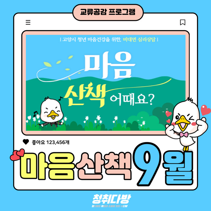 고양시는 청년지원공간 청취다방을 통해 지난 2년간 꾸준히 ‘심리상담’ 프로그램을 운영해왔다. 특히 올해는 기존에 지속해오던 비대면 심리상담인 ‘마음산책’ 프로그램 운영 횟수를 50% 이상 확대했다.